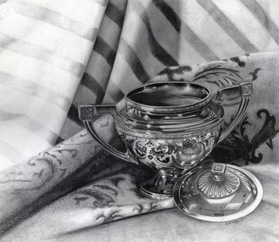 Mike Cotter’s graphite drawing Sugar Bowl was selected for inclusion in The Best of Drawing, an annual special edition by Artists Magazine that highlights exceptional work in contemporary drawing. The piece exemplifies Cotter’s ability to transform everyday objects into deeply symbolic still lifes. Rendered with technical precision and emotional subtlety, Sugar Bowl reflects his commitment to realism and his skill in capturing the quiet narratives found in ordinary forms.